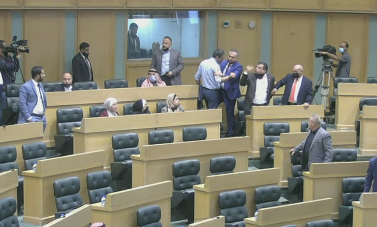 – قرر رئيس مجلس النواب عبدالمنعم العودات رفع جلسة مجلس النواب بعد حدوث فوضى ومشادة كلامية تحت القبة بين نواب والنائب أسامة العجارمة.