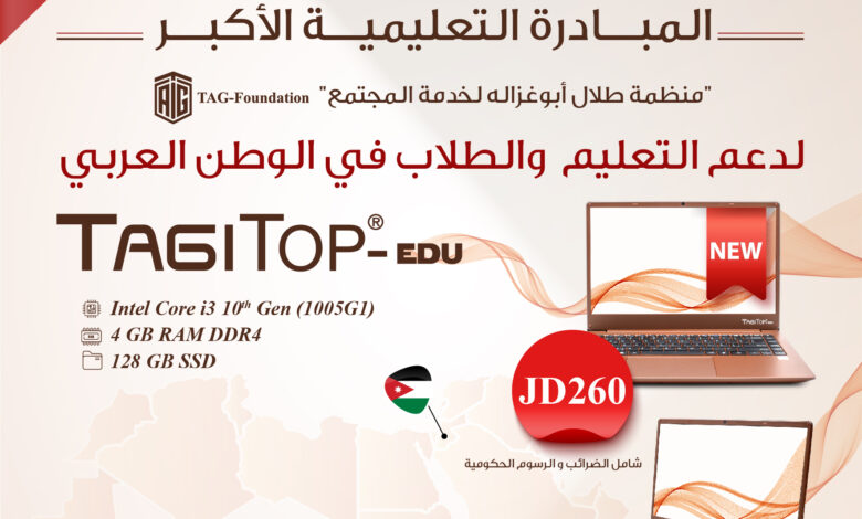 عمان- أطلقت شركة طلال أبوغزاله للتقنية، إحدى شركات “طلال أبوغزاله العالمية”، مبادرة غير ربحية بالتعاون مع منظمة طلال أبوغزاله “الخيرية” (TAG Foundation) لتمكين كل طالب عربي من الحصول على جهاز لابتوب (TAGITOP-EDU) المصنّع لغايات التعلم الرقمي، بسعر رمزي.