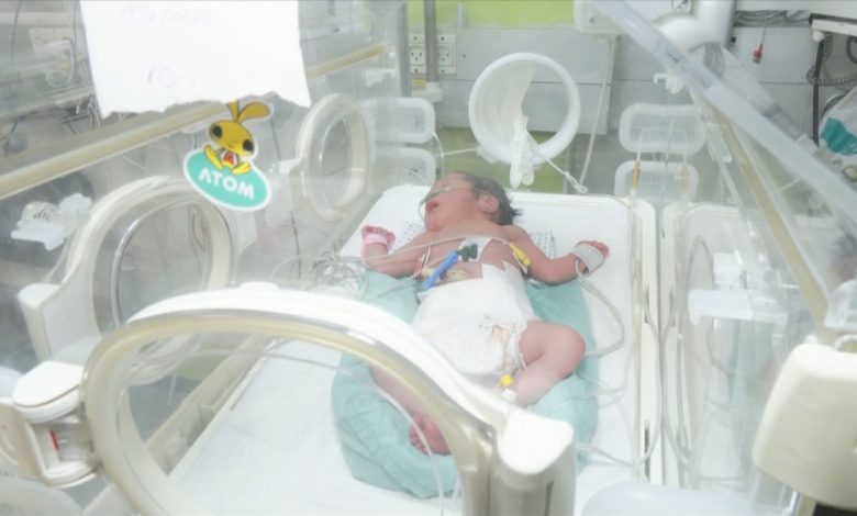 ويتحدث الطبيب النواجحة أن قدر الأم كان استشهادها وتم إحضارها فورا إلى المجمع، وأطباء الجراحة فتحوا بطنها وأخرجوا الجنين حيا وتم إنعاشه وأحضر إلى الحضانة ووضع له الأكسجين ويتلقى الرعاية الطبية حاليا.