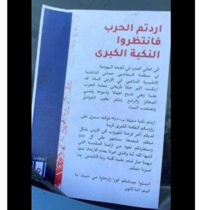 وفي إطار التهديدات بتهجير الفلسطينيين من قطاع غزة إلى مصر، وأهالي الضفة الغربية إلى الأردن، قال المستوطنون في ورقتهم: ‏”أمامكم فرصة أخيرة للهروب إلى الأردن بطريقة منظمة، وبعدها سنقتل كل عدو ونطردكم بالقوة من أرضنا المقدسة… خذ أمتعتك معك فوراً، وارحل لأننا على وشك الوصول” وفق تهديدهم.
