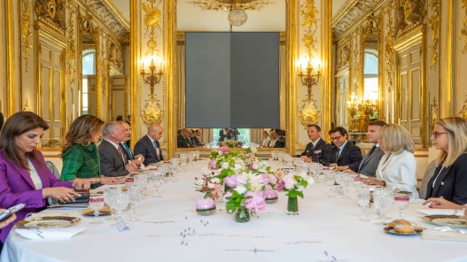 ولدى وصول جلالة الملك، ترافقه جلالة الملكة رانيا العبدالله إلى قصر الإليزيه، كان الرئيس الفرنسي وعقيلته في مقدمة المستقبلين