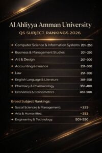 تواصل جامعة عمان الأهلية تعزيز مكانتها الأكاديمية عالميًا، حيث حققت نتائج متميزة في تصنيف QS العالمي للتخصصات لعام 2026.