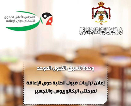أعلنت وحدة تنسيق القبول الموحد في وزارة التعليم العالي والبحث العلمي وبالتنسيق مع المجلس الأعلى لحقوق الأشخاص ذوي الإعاقة لجميع الطلبة ذوي الإعاقة الراغبين بالتقدم بطلبات للاستفادة من المقاعد المخصصة لهم في البرنامج العادي في الجامعات الأردنية الرسمية والطلبة الراغبين بالتجسير في الجامعات الرسمية والخاصة سرعة مراجعة الوحدة، وذلك اعتباراً من صباح يوم الأحد الموافق 28/7/2019 وفقاً للإجراءات التالية: