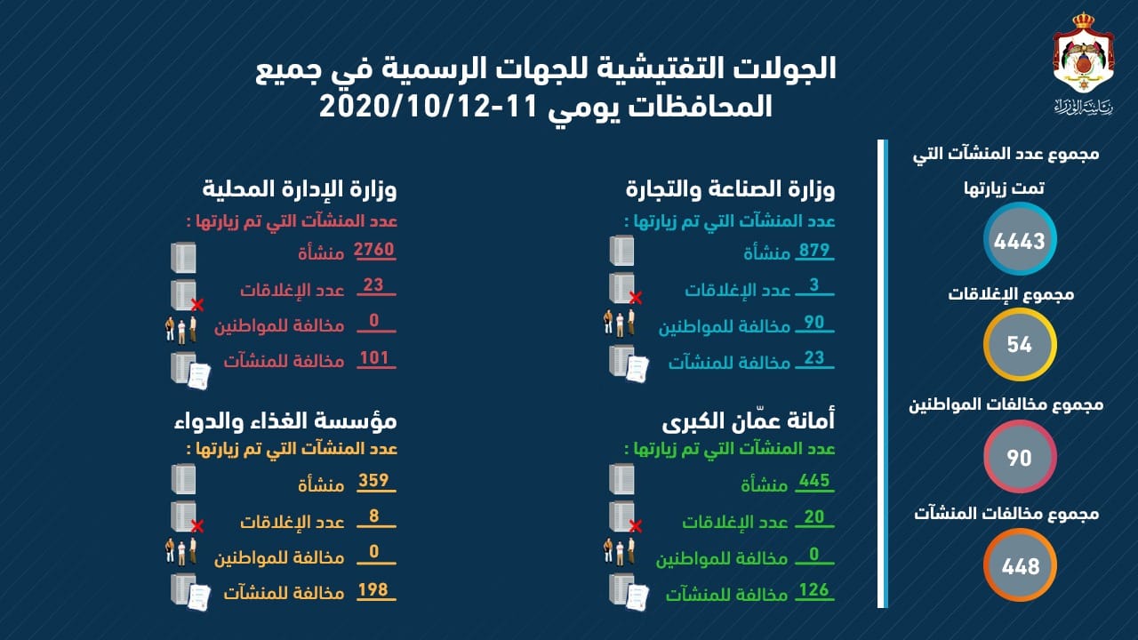 أعلنت وزارة الصناعة والتجارة الثلاثاء، قيام فرق التفتيش الحكومية بزيارة 4443 في كافة محافظات المملكة الأحد والاثنين.