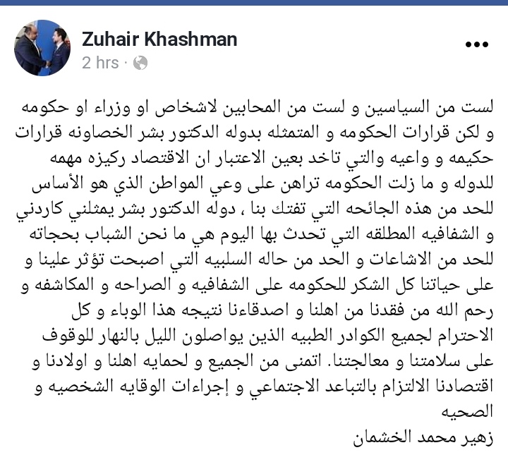 واشار في منشور له على موقع فيس بوك الى أن رئيس الحكومة تحدث بشفافية مطلقة تسهم بالحد من الشائعات والحالة السلبية التي أثرت على يومنا في الآونة الأخيرة.