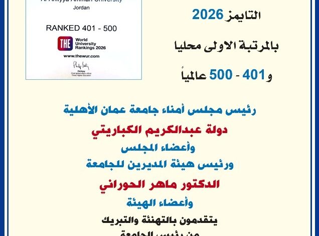 عمان الاهلية تهنىء أسرتها بمناسبة فوزها بتصنيف التايمز 2026 بالمرتبة الاولى محليا و401 – 500 عالميا